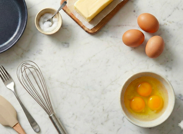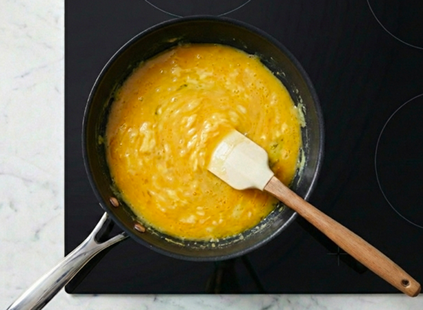 Cook whisked eggs and cold butter over medium-low heat, stirring constantly to create a custard-like emulsion. Pull the pan when the eggs look glossy and slightly too wet – and let residual heat finish the set.